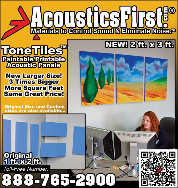 We still have the box of Ten 1’x2′ Tone Tiles™ for $325, but now you have the option to get a box of Four 2’x3′ Tone Tiles™ for the same $325! These are still paintable or printable, just bigger ~ So they have a larger impact visually and acoustically! Know an artist? Support the local artists or the artist in your own house – and create a one-of-a-kind piece of acoustic art!