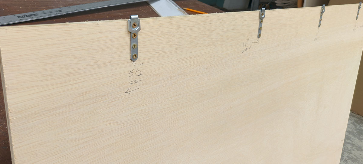 While the stain dried, the mounting plywood was cut down to hide behind the planks. Four hanging straps with eye-loops were then added to the top edge of each of the plywood sections, and spaced to avoid studs.