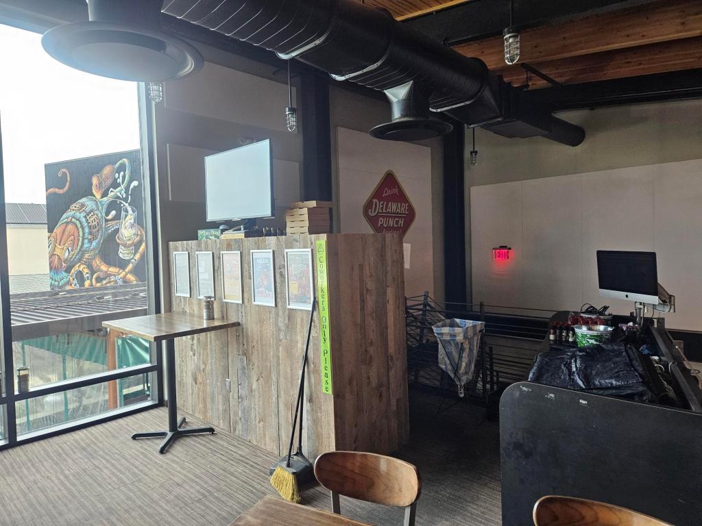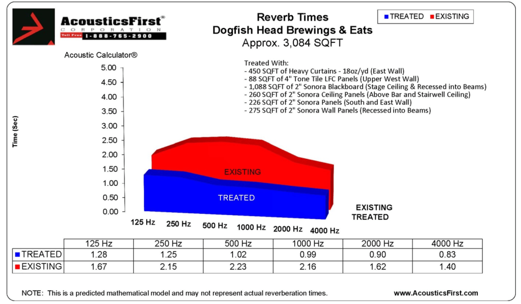 Dogfish Head Brewing & Eats is a brewery, restaurant and performance venue located in Rehoboth Beach, DE. This largely reflective space has a wood ceiling, an un-polished concrete floor and walls comprised of drywall, unfinished wood planks (over OSB) and glass. These hard surfaces promote reverberation and early reflections, resulting in a noisy and “muddy” sounding environment.