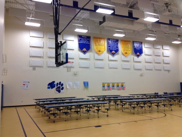 Cloudscape® Baffles are a wonderful product! This batch of baffles was installed in a middle school gymnasium/multi-purpose room by one of our dealers. Note how they were installed not just in the ceiling, but also on the walls by ‘chaining’ the baffles together. Most of the time we recommend hi-impact Sonora® Panels for the walls in school gyms such as this, but with a little ingenuity baffles can also get the job done!