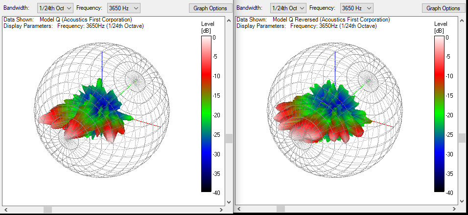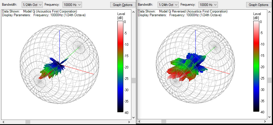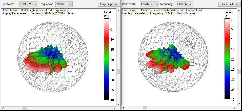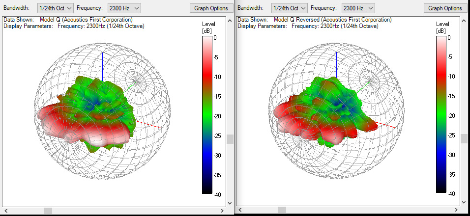 Again, we have two similar looking balloons, but there seems to be a bit more variation. The welled-design (left) shows a smoother 1D pattern in the front as the wells release sound within the same plane – at the front face of the wells. On the right you will notice sharper and more discreet lobes, but you will also notice that it has wider horizontal performance again, as it isn’t as front focused due to its free standing elements. The vertical performance is also a bit different – the welled design is broad and smoother vertically, while the reversed installation shows sharp lobes again.