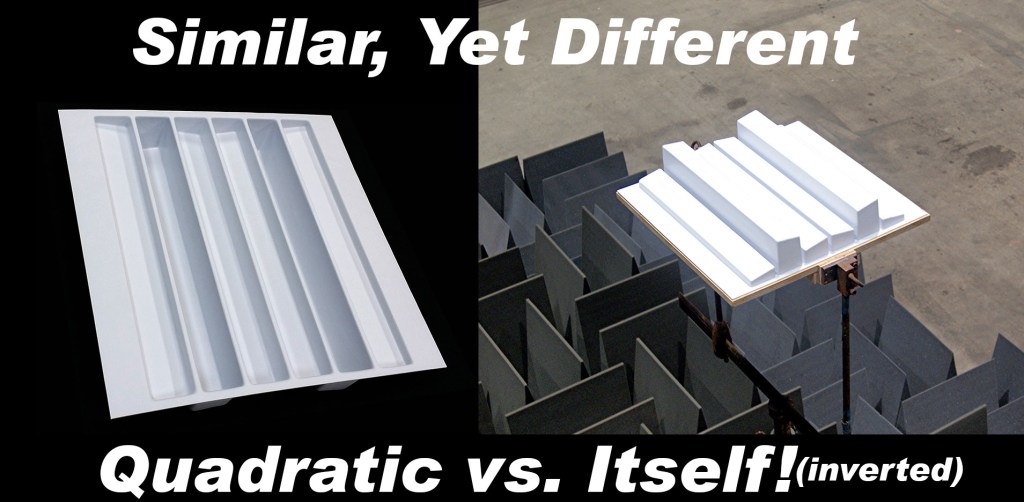 Taking “similar” to the extreme in this case, we are testing the difference in performance of a 1-dimensional, welled-quadratic diffuser installed in the standard welled configuration, and then installed reversed – with the sound impeding on the back side of the wells. For a bit of history, the Classic Quadratic Diffuser (or Schroeder diffuser) was designed with a grid separating the reflectors – creating wells of different depths proportional to the remainders of n2 (mod N). This design has some interesting facets.