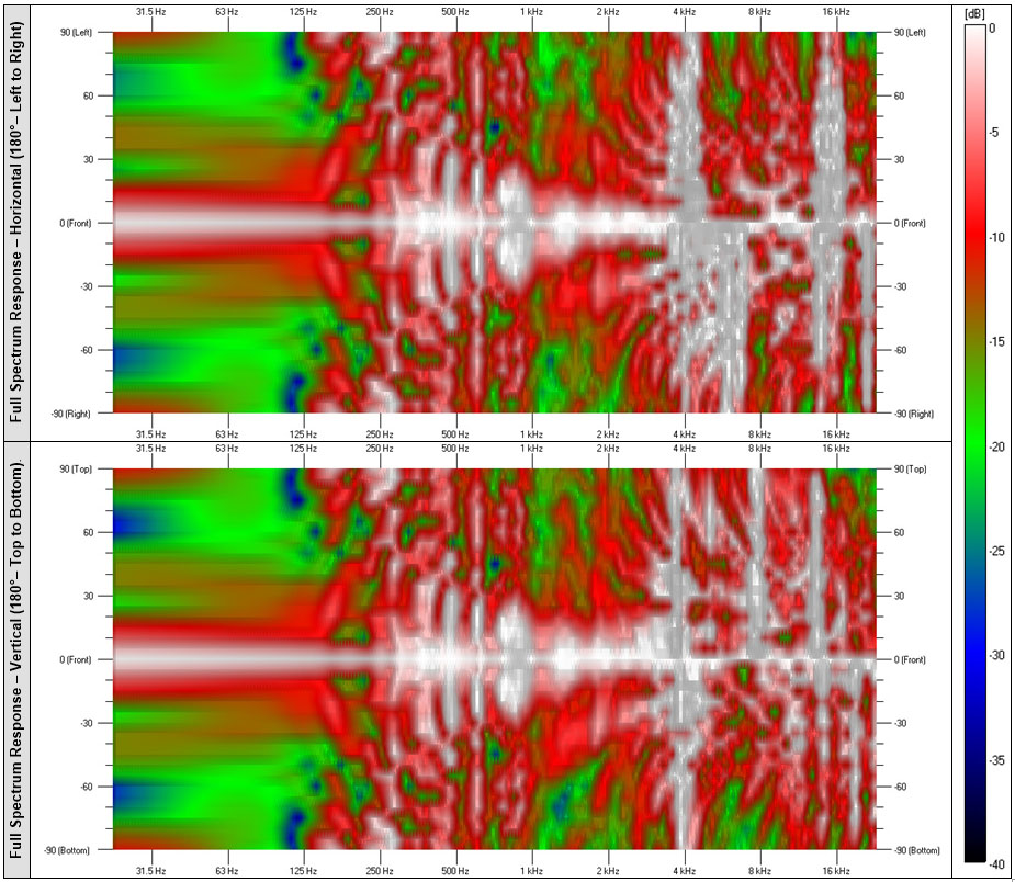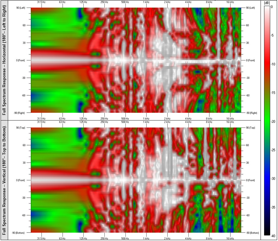 The Model C has a nice even diffusion profile through it’s primary working range. This is a product of the QRD design and binary distribution. The set size for the blocks guarantees a solid primary frequency range from about 1KHz to over 4Khz. This tunes the Model C squarely in the most sensitive bands of the human hearing range. Below this range the device becomes a bit of an absorber. Above this range and the performance becomes more effective at intervals, which can be seen in the areas of wide diffusion at 6KHz – 18 KHz. These repeating zones are common in “stepped” quadratic designs. Due to the heights of the well being at specific intervals, the intervals repeat at octaves of their effective bands.