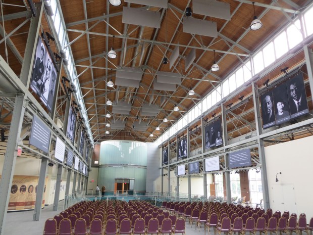 The Brown Forman Great Hall at KCAAH, showing the Silent Pictures®/Sonora® baffle portraits and quotes on the left, and the gray Cloudscape® baffles above.
