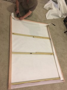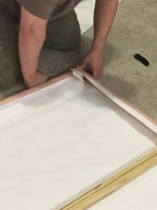 Lay out the material and attach it to the frame. Be careful when putting the frame on the material. Take care in lining up the graphic to the frame, and keep an eye out for wrinkles and folds.