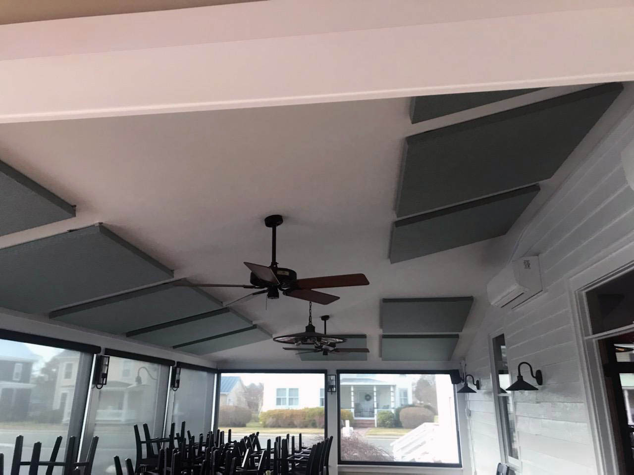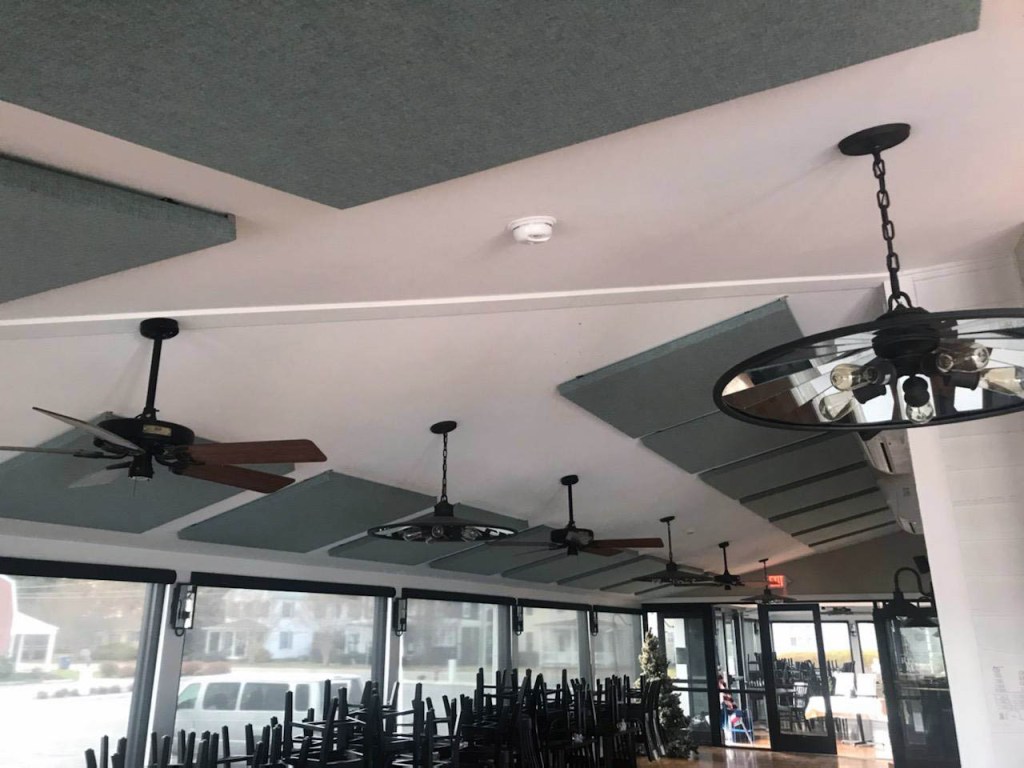 This ceiling was sloped toward the massive windows on the outside wall, and it had lights and fans running right up the center. Complicating things further, the opposite wall had sconce lighting, doorways, HVAC, and even more windows. Finally, the floor was not carpeted to facilitate cleaning – as is the norm in many dining spaces.